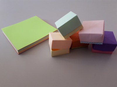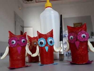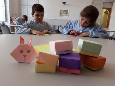 Pliages origami, scoubidous, pompons de laine, assemblages de matériaux, pâte à modeler et coloriages.