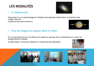 Les premières S partent s'initier à la démarche scientifique sur le terrain : Maîtrise de l’énergie à Metz, écologie et qualité de l'eau à Vittel, génétique à Luminy ou astronomie à Saint Michel l'Observatoire.